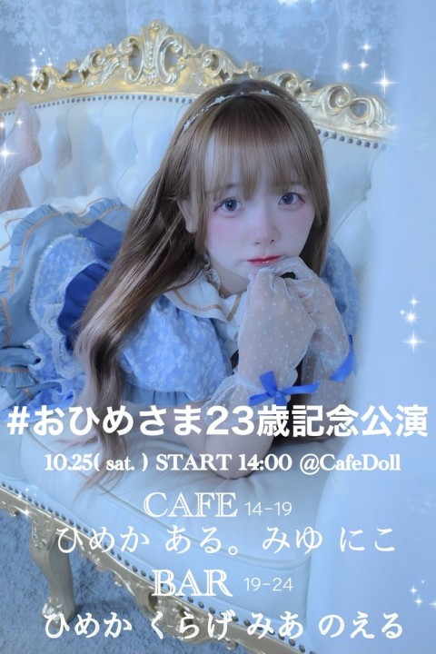 10/25カフェタイム(14-19)オープンしております! 本日はひめかキラキラです! ひめか ある。みゆ にこ でお待ちしております♪ #おひめさま23歳記念公演 https://t.co/EcY1XAiY5f