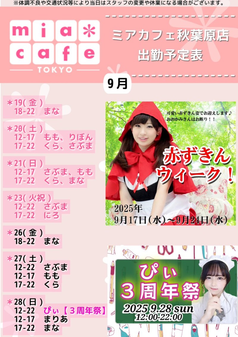 赤ずきんウィークinミアカフェ秋葉原店 2025年9月17日(水)~24日(水) 9月19日(金)  18-22 まな・初回勤務の新人さん 9月20日(土)  12-17 もも・りぼん  17-22 さぶま・くら 9月21日(日)  12-17 さぶま・もも  17-22 くら・まな 出勤一覧  https://t.co/inbQ85tzfB https://t.co/tDcSyyR3ho