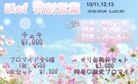 10/12(日) 〜本日のElef〜 特別営業 2日目♡スキニヌ Bar time OPEN18:00 CLOSE 23:00Lo22:30 もも@_momelody れんた@100_Elef 桔梗@l7o3c れん@_renchama ちぎ@CHIPIHIME_ あい@ai_elef 皆様のご来店 心よりお埅ちしおたす 近日むベント予定 10/11,12,13 特別営業 https://t.co/UL5oTVyT3D