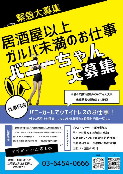 【🐰#バニーガール 急募集🐰】 #ガールズバー ではないバニーウェイトレス♪ 年末のフル営業に向けて大急募集中👯‍♀️ ピアス・タトゥー・派手髪・ダブルワークなんでもOK! XのDMからでもLINEからでも気軽にご連絡下さい! HP:https://t.co/lP3cTfBWQz LINE:https://t.co/mpiqwxmGan #バイト募集 #中野 https://t.co/JTpIYCnZFy