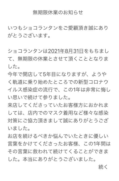新型コロナウイルスの感染拡大、政府の要請などの影響により、2021年9月から休業させて頂くこととなりました。再開は未定です。 https://t.co/NnpsPz1vwo