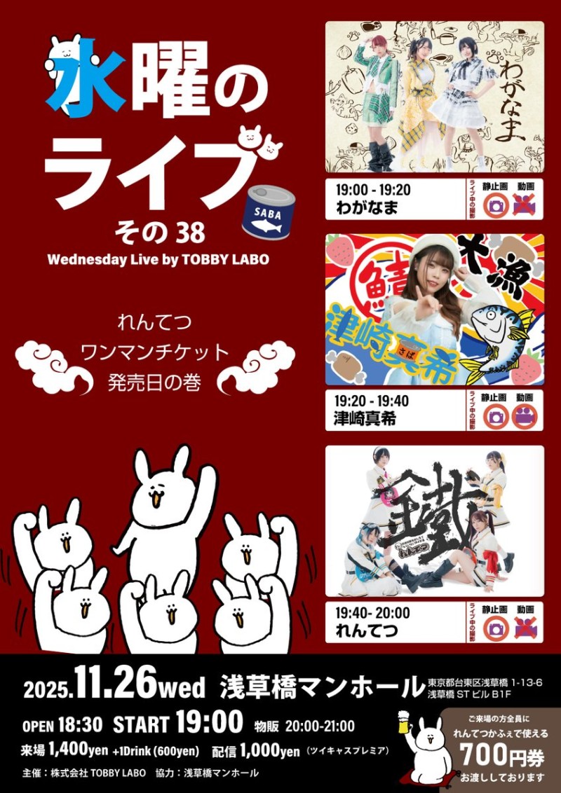 れんてつワンマンライブ(2026.2.1)チケット発売日! 🚃出演情報&タイムテーブル公開🚃 11/26(水)水曜のライブ その38 📍浅草橋マンホール ⏰OPEN 18:30/ START 19:00/ CLOSE 21:00 🎤19:40-20:00 📸20:00-21:00 🎫 1,400円 (別途1D600円) 🔗https://t.co/pFLyb1hCRG 🎥配信 1,000円 https://t.co/W2ETo1JjUy