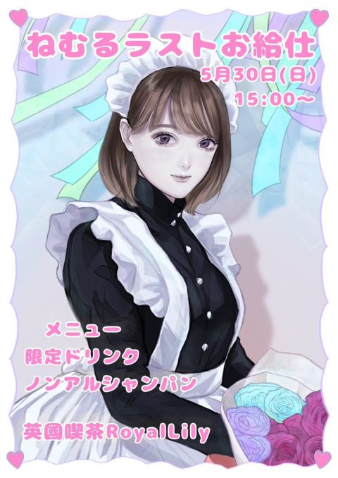 ねむるラストお給仕 日程:5月30日 半年間頑張ってお給仕をしてきたねむるのラストお給仕! お時間ありましたらねむるのラストお給仕ご帰宅よろしくお願いします。 https://t.co/YSuPhd8Rud