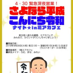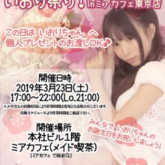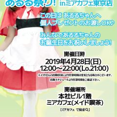 | å¶æ¥æé | âãã¢ã«ãã§æ±äº¬åºïŒã¡ã€ãã«ãã§ïŒhttp://www.mia-cafe.com/ãâ â¡å¹³æ¥ãæïœéãïŒïŒïŒïŒïŒïœïŒïŒïŒïŒïŒ â¡åæã»æ¥æã»ç¥æ¥ãïŒïŒïŒïŒïŒïœïŒïŒïŒïŒïŒ â å®äŒæ¥ããªãïŒ2019幎1æããå®äŒæ¥å»æ¢ïŒ â¡ã©ã¹ããªãŒããŒãéåºã®ïŒïŒåå ãïŒïŒïŒïŒïŒéåºã®å ŽåâïŒïŒïŒïŒïŒã©ã¹ããªãŒããŒ å¶æ¥æ¥ãåºå€ç¶æ³ã«ã€ããŠã¯ãã¡ãã http://pandaland.cutegirl.jp/mif/c_cms_csv/sch_top.php âãã¢ãªã©ïŒãã©ãæ±äº¬åºïŒæ®åœ±äŒïŒãªãã¬ïŒhttp://www.mif-lr.com/ãâ â¡å šæ¥ãïŒïŒïŒïŒïŒãïŒïŒïŒïŒïŒãã§ãããªã©ã¯ãŒãŒã·ã§ã³åºå€ã¹ã¿ãããããæé垯ã®ã¿å¶æ¥ã§ãã â å®äŒæ¥ã¯äžå®äŒïŒåºå€ã¹ã¿ãããããæé垯ã®å¶æ¥ïŒ â¡æçµåä»ãéåºã®ïŒïŒåå ãïŒïŒïŒïŒïŒéåºã®å ŽåâïŒïŒïŒïŒïŒïŒïŒïŒïŒïŒïŒè¿ã«æœè¡æéãçµããã³ãŒã¹ïŒ â»é«æ ¡çäžå¯ âæ·±å€å¶æ¥ã«ã€ããŠã¯ãå ¬åŒãµã€ãå³äžã® http://market.chu.jp/schedule1/sche37.cgi ãã¢ã°ã«ãŒãç·åã¹ã±ãžã¥ãŒã«ïŒïŒ°ïŒ£ã»ã¹ããïŒ http://market.chu.jp/schedule1/sche37.cgi?dm=1 ãã¢ã°ã«ãŒãç·åã¹ã±ãžã¥ãŒã«ïŒã¬ã©æºåž¯ïŒ ãã芧ãã ãããåç¥æ¥ã®ã¿å¶æ¥ãšãªããŸããåç¥æ¥ä»¥å€ã¯æ·±å€å¶æ¥ããããŠãããŸããã æ·±å€å¶æ¥å¯Ÿè±¡æ¥ãïŒïŒïŒïŒïŒãç¿æïŒïŒïŒïŒïŒïŒ¬ïŒïŒ¯ïŒïŒïŒïŒïŒïŒ | ||||||||||||||