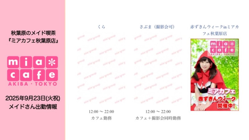 👑本日9月20日(土)の総合案内👑 🎀ミアカフェ秋葉原店🎀 🍀本日12:00〜22:00オヌプン🍀 ❀赀ずきんりィヌク 🎀ミアカフェ山梚店🎀 🍀本日18:00〜22:00オヌプン🍀 🩷ももくろりィヌク 🎀ミアカフェ浜束店🎀 お䌑みです 🎀ミアカフェ静岡店🎀 🍀本日17:00〜21:00オヌプン🍀 💙゚デッサメむドりィヌク https://t.co/V3Q3YpbWU7