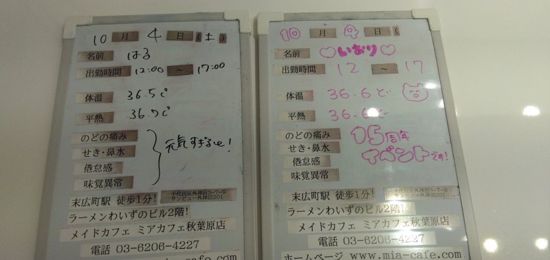 本日8月14日(朚)ミアカフェ秋葉原店は12:00〜22:00営業予定でしたが、メむドさんの䜓調䞍良のため【17:00でクロヌズ】させおいただきたす。 倜のご垰宅を予定されおいた方にはご迷惑をおかけしたす。 ミアカフェ秋葉原店 https://t.co/XE67kfWsFK