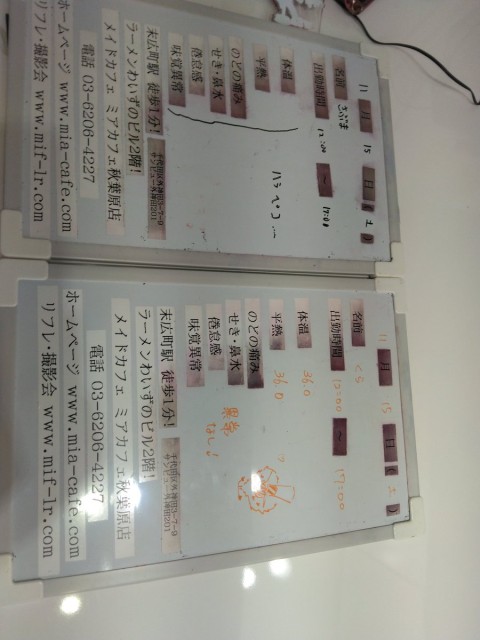 | 営業時間 | ●ミアカフェ東京店(メイドカフェ)http://www.mia-cafe.com/ ● □平日 月~金 17:00~22:00 □土曜・日曜・祝日 12:00~22:00 ★定休日 なし(2019年1月より定休日廃止) □ラストオーダー 閉店の60分前 22:00閉店の場合→21:00ラストオーダー 営業日や出勤状況についてはこちら。 http://pandaland.cutegirl.jp/mif/c_cms_csv/sch_top.php ●ミアリラ&フォト東京店(撮影会&リフレ)http://www.mif-lr.com/ ● □全日 12:00〜22:00 ですがリラクゼーション出勤スタッフがいる時間帯のみ営業です。 ★定休日は不定休(出勤スタッフがいる時間帯の営業) □最終受付 閉店の45分前 22:00閉店の場合→21:15(21:50迄に施術時間が終わるコース) ※高校生不可 ●深夜営業については、公式サイト右上の http://market.chu.jp/schedule1/sche37.cgi ミアグループ総合スケジュール(PC・スマホ) http://market.chu.jp/schedule1/sche37.cgi?dm=1 ミアグループ総合スケジュール(ガラ携帯) をご覧ください。告知日のみ営業となります。告知日以外は深夜営業いたしておりません。 深夜営業対象日 22:00〜翌朝5:00(L.O.4:00) | ||||||||||||||