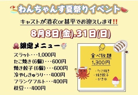 わんちゃんすオープンしました! 本日夏祭りイベントです👘 1300円で たこ焼き&餃子&かき氷食べ放題❣️ 限定フードもご用意しております🫶 もも おる さち りちゃ でお待ちしております! https://t.co/IEjTdsKxIQ