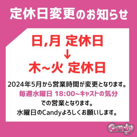 日頃からCandyをご愛顧頂きありがとうございます🍭 当店は本日で通常営業を終了し、明日以降は毎週水曜日のみの営業となります それに伴い、メニューも大幅に変更させていただくことになりました これからもCandyをよろしくお願い致します🙇‍♂️ https://t.co/eLhyC44Rb7