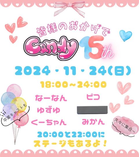 Candy15周年イベントはじまりましたー!! みんなでたくさん飲んで、たくさん歌ってたくさん笑って楽しみましょー!!🤍 ぴこ なーなん ゆずゆ くーちゃん みかん の5人でお待ちしてます✨ ※蛍はお休みになりました https://t.co/Qhh9D3BhGP