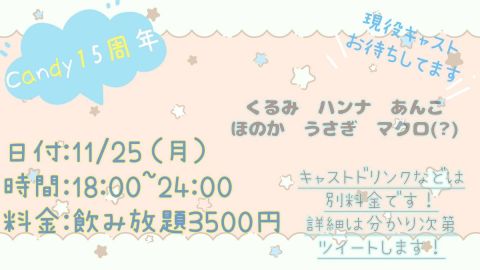 Candy15周年イベントはじまりましたー!! みんなでたくさん飲んで、たくさん歌ってたくさん笑って楽しみましょー!!🤍 ぴこ なーなん ゆずゆ くーちゃん みかん の5人でお待ちしてます✨ ※蛍はお休みになりました https://t.co/Qhh9D3BhGP