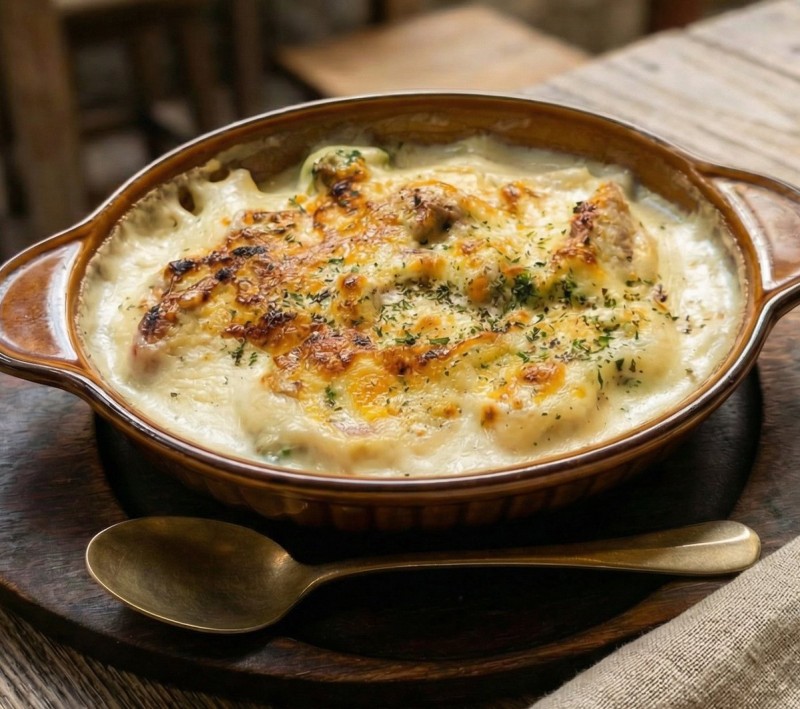 ホワイトソース、焦がしチーズ、皮を丁寧に取り除いた大きなもも肉、全部仕事を入れた
