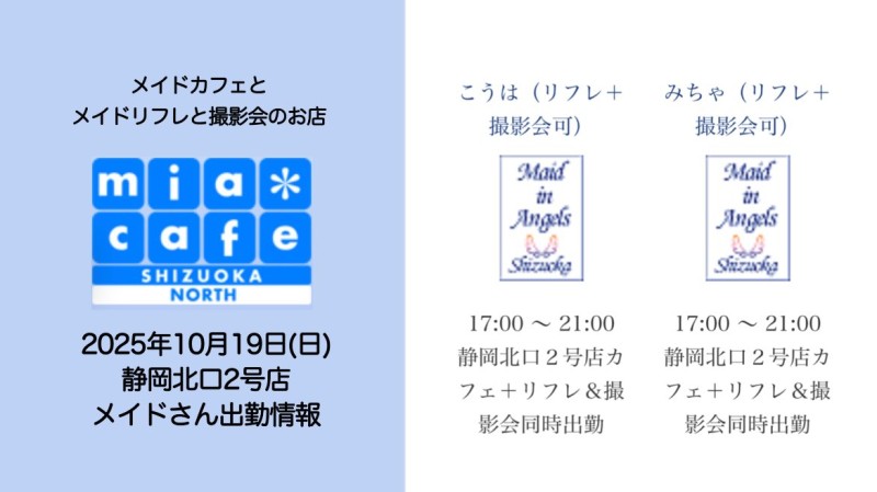 | 営業時間 | 静岡店は出勤スタッフがいれば営業です! 基本的に 12時~22時が営業時間です! ●静岡店のツイッター @shizuokamaidsan https://twitter.com/shizuokamaidsan ●ミア静岡店の営業曜日&営業時間● ☆月〜木 14:00〜22:00(最終受付20:00) ☆金曜日 12:00〜22:00(最終受付21:00) ☆土・日・祝 12:00〜22:00(最終受付21:00) 営業時間外はオンライン予約にてお願いいたします。 PC・携帯共通 → http://m-kanzume.moo.jp/yoyaku2/user.cgi ●ミアガイド出勤状況● スマホ・PC → 後日公開予定 ★静岡店スタッフによるミア甲府店でのメイドカフェリアル営業★ ☆不定期 サイトにてご確認ください。 http://market.chu.jp/schedule1/sche37.cgi | ||||||||||||||