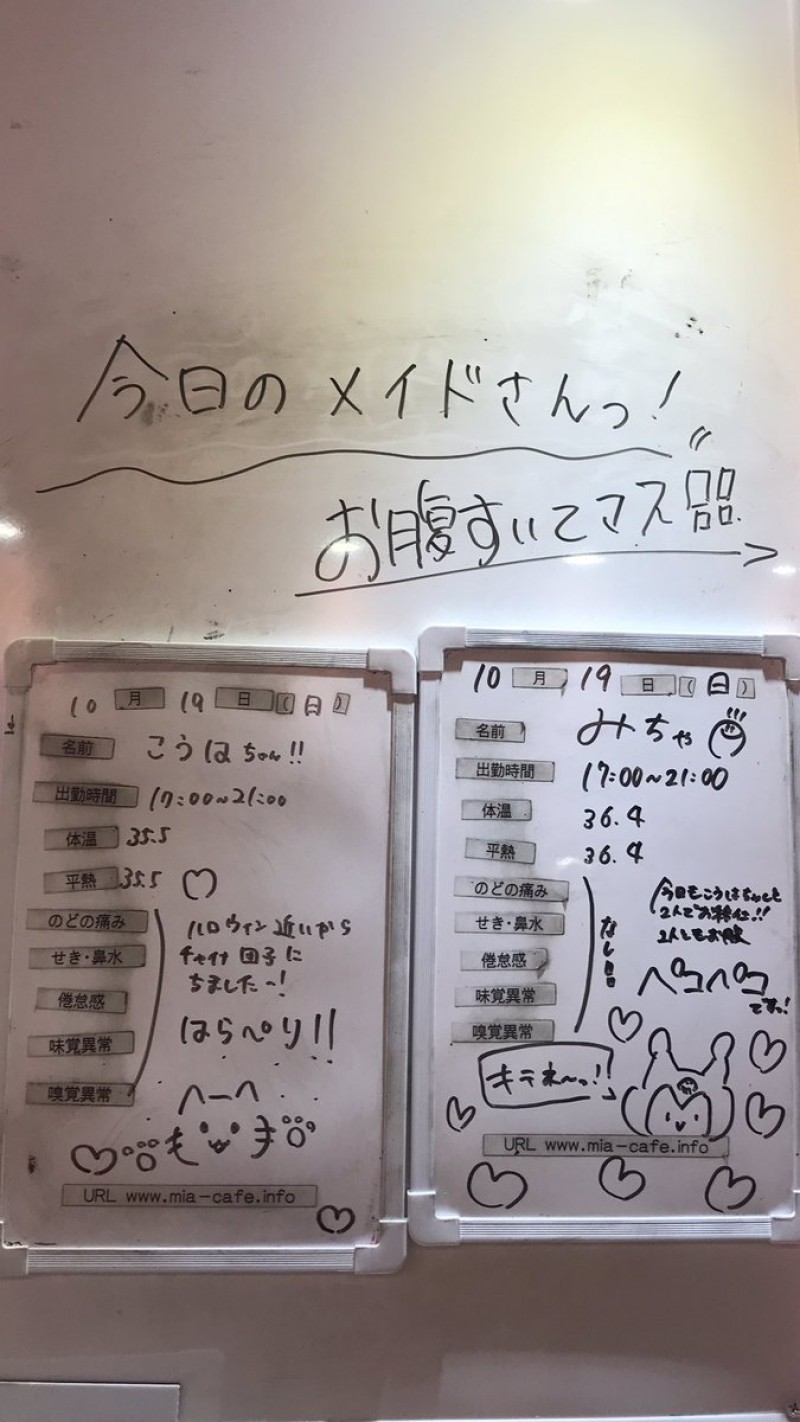 | 営業時間 | 静岡店は出勤スタッフがいれば営業です! 基本的に 12時~22時が営業時間です! ●静岡店のツイッター @shizuokamaidsan https://twitter.com/shizuokamaidsan ●ミア静岡店の営業曜日&営業時間● ☆月〜木 14:00〜22:00(最終受付20:00) ☆金曜日 12:00〜22:00(最終受付21:00) ☆土・日・祝 12:00〜22:00(最終受付21:00) 営業時間外はオンライン予約にてお願いいたします。 PC・携帯共通 → http://m-kanzume.moo.jp/yoyaku2/user.cgi ●ミアガイド出勤状況● スマホ・PC → 後日公開予定 ★静岡店スタッフによるミア甲府店でのメイドカフェリアル営業★ ☆不定期 サイトにてご確認ください。 http://market.chu.jp/schedule1/sche37.cgi | ||||||||||||||