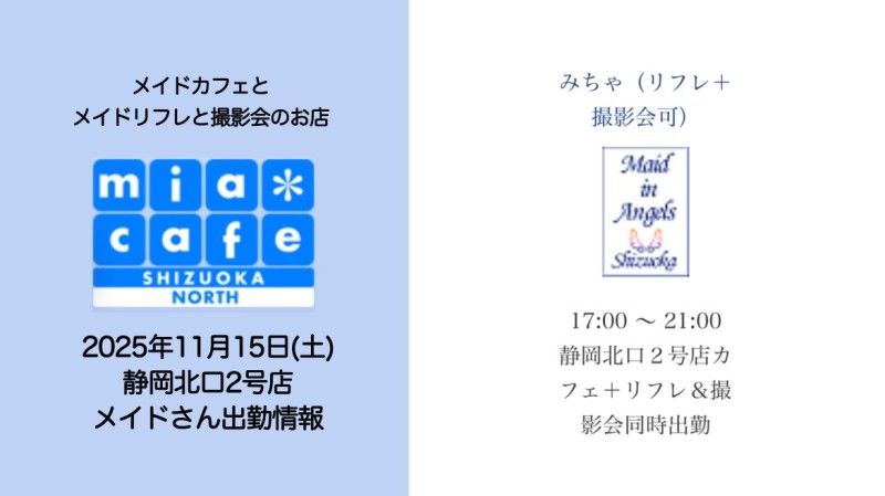 | 営業時間 | 静岡店は出勤スタッフがいれば営業です! 基本的に 12時~22時が営業時間です! ●静岡店のツイッター @shizuokamaidsan https://twitter.com/shizuokamaidsan ●ミア静岡店の営業曜日&営業時間● ☆月〜木 14:00〜22:00(最終受付20:00) ☆金曜日 12:00〜22:00(最終受付21:00) ☆土・日・祝 12:00〜22:00(最終受付21:00) 営業時間外はオンライン予約にてお願いいたします。 PC・携帯共通 → http://m-kanzume.moo.jp/yoyaku2/user.cgi ●ミアガイド出勤状況● スマホ・PC → 後日公開予定 ★静岡店スタッフによるミア甲府店でのメイドカフェリアル営業★ ☆不定期 サイトにてご確認ください。 http://market.chu.jp/schedule1/sche37.cgi | ||||||||||||||