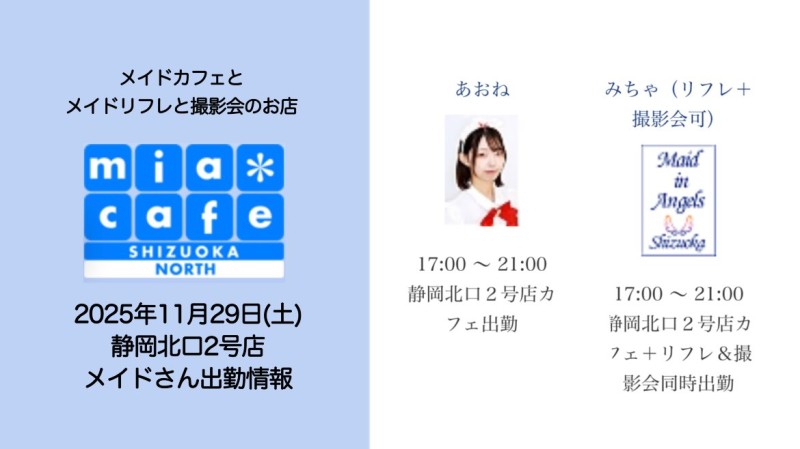 | 営業時間 | 静岡店は出勤スタッフがいれば営業です! 基本的に 12時~22時が営業時間です! ●静岡店のツイッター @shizuokamaidsan https://twitter.com/shizuokamaidsan ●ミア静岡店の営業曜日&営業時間● ☆月〜木 14:00〜22:00(最終受付20:00) ☆金曜日 12:00〜22:00(最終受付21:00) ☆土・日・祝 12:00〜22:00(最終受付21:00) 営業時間外はオンライン予約にてお願いいたします。 PC・携帯共通 → http://m-kanzume.moo.jp/yoyaku2/user.cgi ●ミアガイド出勤状況● スマホ・PC → 後日公開予定 ★静岡店スタッフによるミア甲府店でのメイドカフェリアル営業★ ☆不定期 サイトにてご確認ください。 http://market.chu.jp/schedule1/sche37.cgi | ||||||||||||||